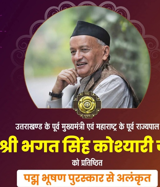 मुख्यमंत्री ने कहा कि भगत सिंह कोश्यारी जी को पद्म भूषण सम्मान प्रदान किए जाने की घोषणा समस्त उत्तराखंडवासियों के लिए अत्यंत गौरव और प्रसन्नता का विषय है। यह सम्मान उनके संपूर्ण सार्वजनिक जीवन, राष्ट्रसेवा और समाजहित के प्रति समर्पण का यथोचित सम्मान है।