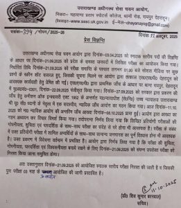 उत्तराखंड अधीनस्थ सेवा चयन आयोग ने 21 सितंबर को आयोजित स्नातक स्तरीय परीक्षा को रद कर दिया है। आयोग के सचिव डॉ. शिव बरनवाल ने शनिवार को जारी आदेश में कहा कि परीक्षा की गोपनीयता, शुचिता और पारदर्शिता सुनिश्चित करने के लिए यह कदम उठाना आवश्यक था।