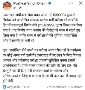 धामी सरकार ने एकल सदस्यीय जांच आयोग की रिपोर्ट के आधार पर परीक्षा रद करने के फैसले के साथ ही सीबीआई जांच को भी औपचारिक रूप से मंजूरी दे दी है। इससे यह स्पष्ट हो गया है कि सरकार इस मामले को गंभीरता से ले रही है और कोई भी लापरवाही बर्दाश्त नहीं की जाएगी।
